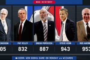 (神算子帕特·莱利832场第2少,波波维奇887场第3少,红衣主教奥尔巴赫953场排在第5)