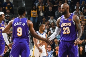 挺会安排!湖人发布赢球海报:封面为詹姆斯和布朗尼父子击掌瞬间